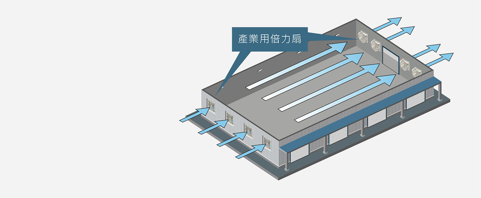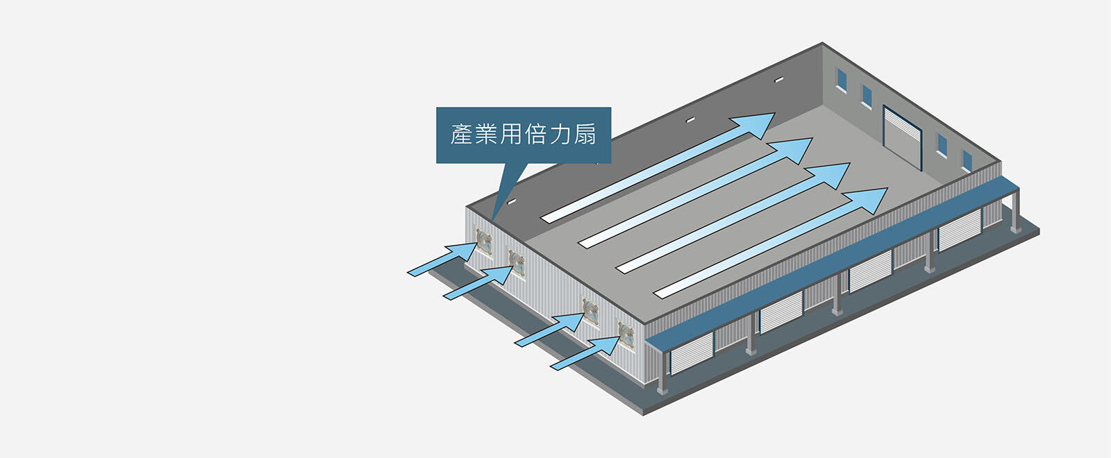廠房內,採取負壓或正壓形式,將ALASKA產業用倍力扇安裝於一側的牆面,另一側可打開窗戶或是門口,將有效改善廠房通風不良、悶熱不適等問題,也有助於消除積存於廠房內空氣中的有害污染物。