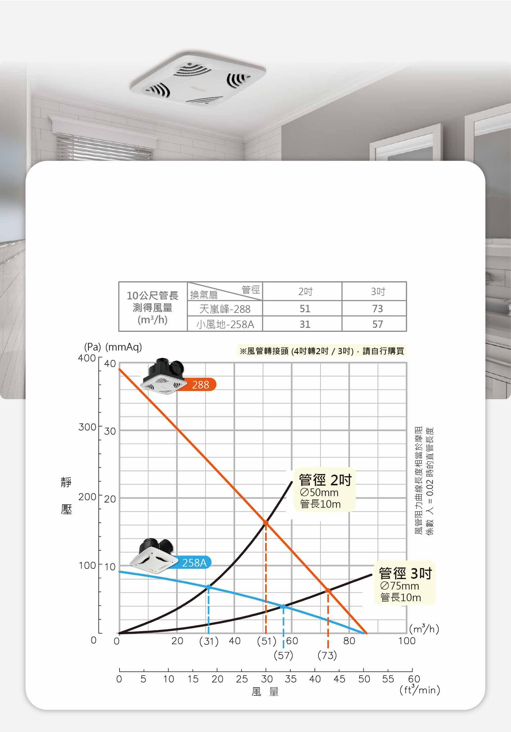 專為2~3吋風管設計的天嵐峰-288無聲換氣扇,擁有全國第一39mmAq超高靜壓,以小風地-258A為例,並依據靜壓風量曲線表,10公尺的2吋與3吋管線其風量相較下,可以明顯看到,天嵐峰-288無聲換氣扇不畏管損,依然維持高輸出風量,非常適合透天、排風管超長之住宅使用,保持浴室空氣清新乾燥。