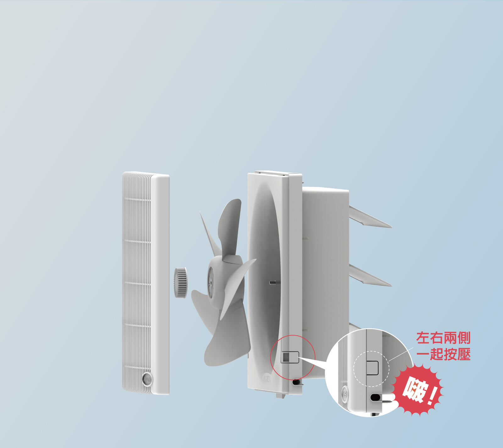面板與扇葉皆可輕鬆拆卸,無需工具即可完成清潔,輕壓兩側卡扣即可取下面板,扇葉旋轉即可拆裝,清潔保養更快速。