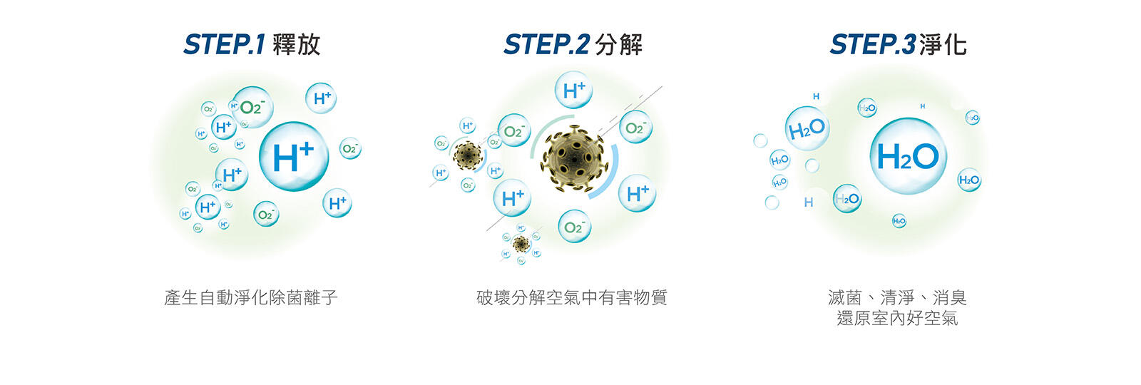 淨化離子模組,經放電後釋放出正(H+)、負離子(O2-),並由水分子包覆於空氣中,之後附著於浮游細菌表層,反應產生出氫氧自由基(OH),將細菌表層蛋白質的氫(H)抽離,並開始分解蛋白質破壞細菌結構。