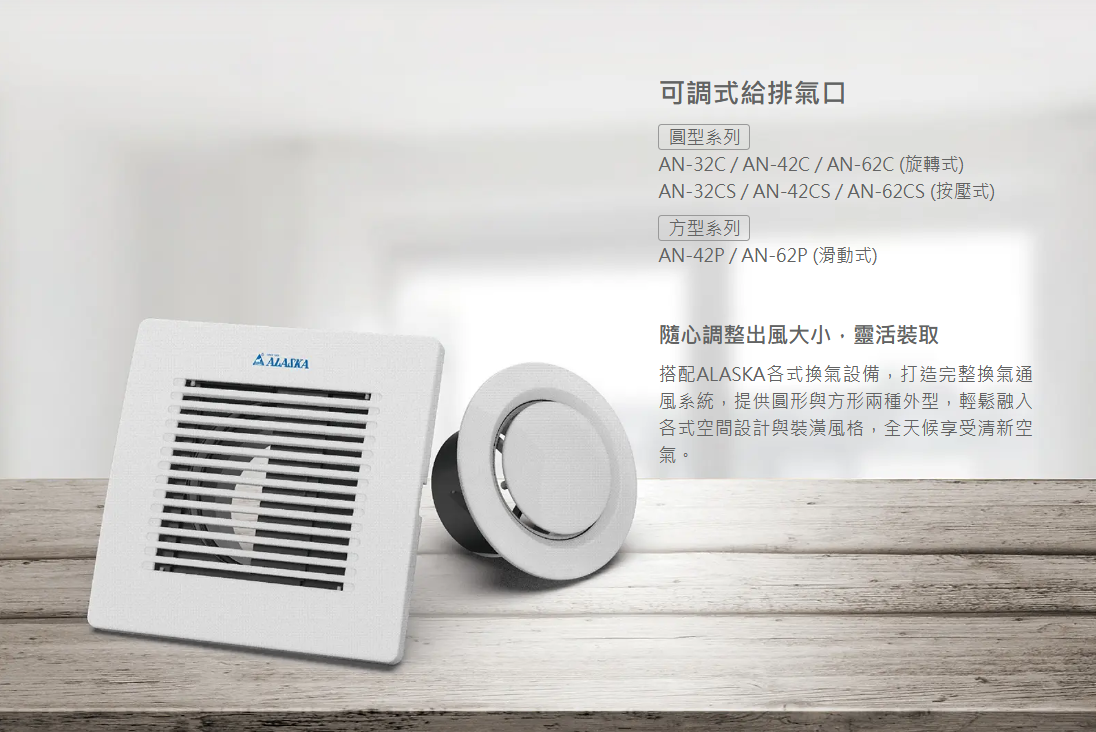 搭配ALASKA各式換氣設備,打造完整換氣通風系統,提供圓形與方形兩種外型,輕鬆融入各式空間設計與裝潢風格,全天候享受清新空氣。