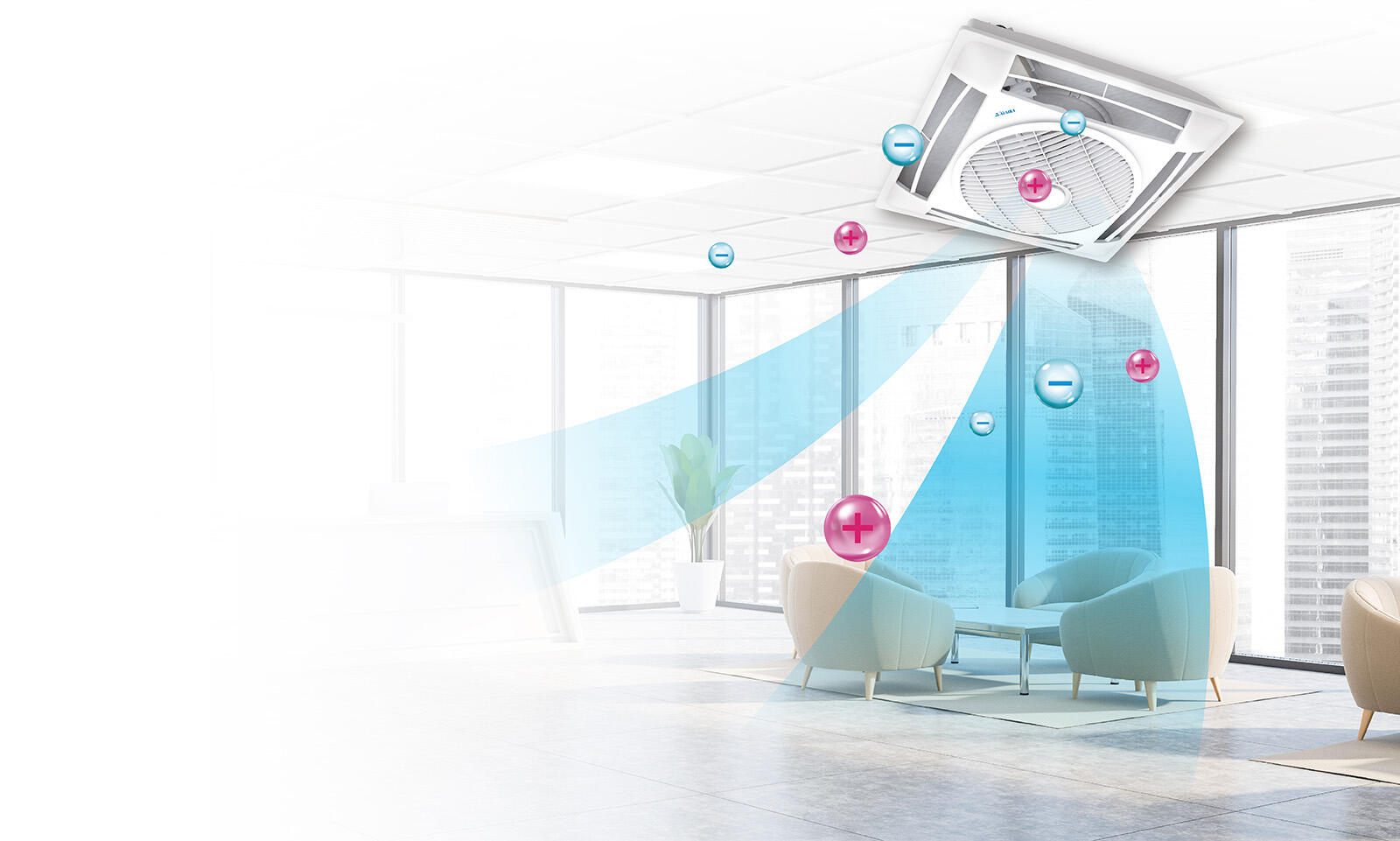 ALASKA將多年研究的Plasma淨化離子技術,搶先運用於輕鋼架節能循環扇中,透過模組釋放1500萬ions/cm3高濃度淨化除菌離子,自動淨化導流入循環扇的空氣,全效抑制有害物質,再將乾淨的空氣循環送至室內每一處。