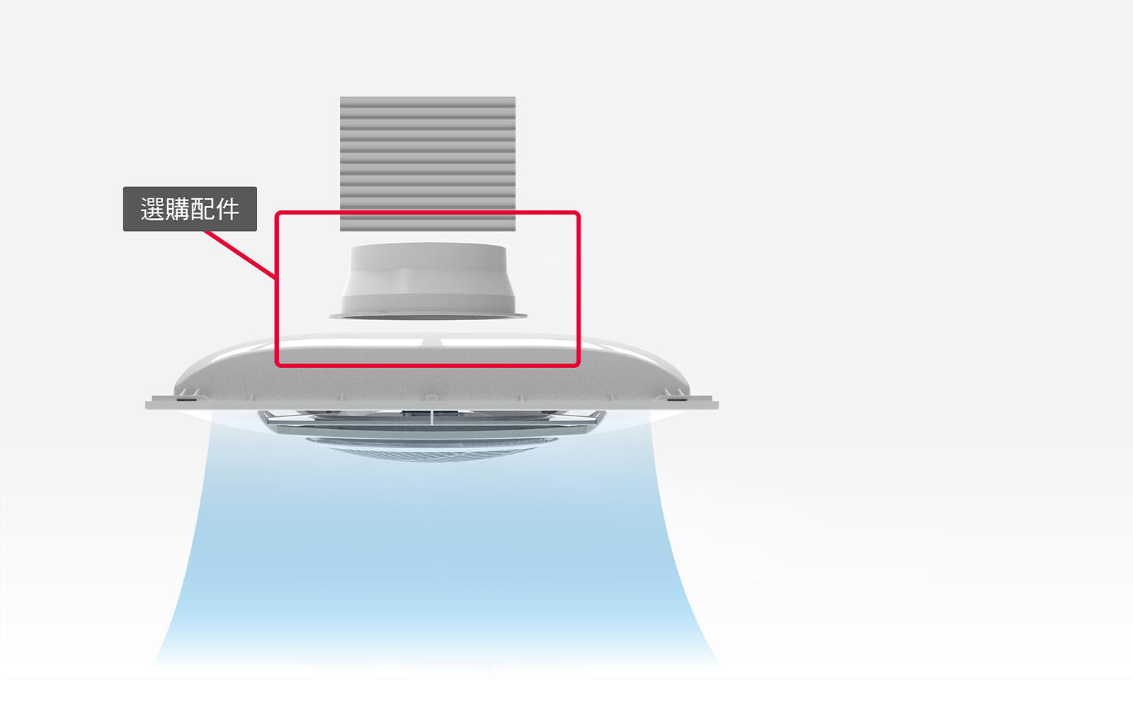 可選購循環扇風管連接環(8吋風管),機身背後連接冷氣出風由循環扇廣角送風至各處,隨時享受沁涼感。
