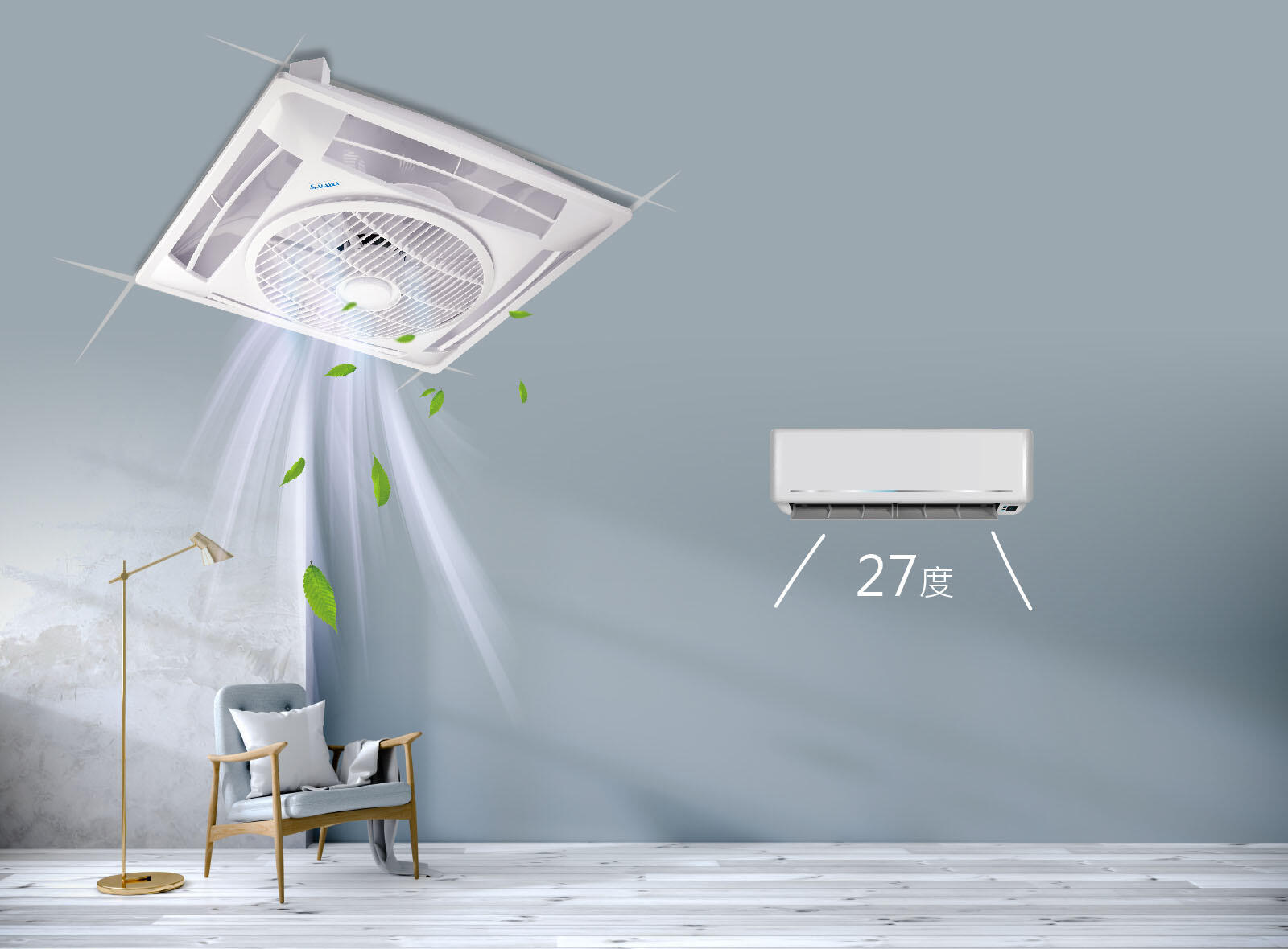 將空調設定維持在27℃搭配ALASKA輕鋼架節能循環扇,便能循環空氣迅速降低室內溫度,有效降低空調負擔,將舒服涼風傳遞每一處,有效降低空調壓縮機負載。