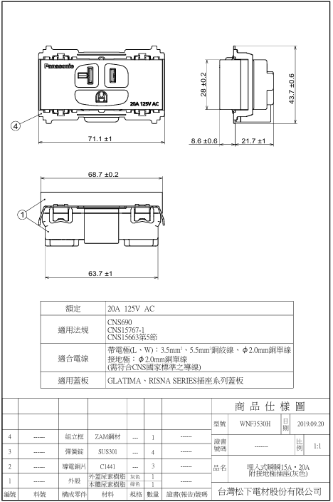★插座:20 A 125 V AC