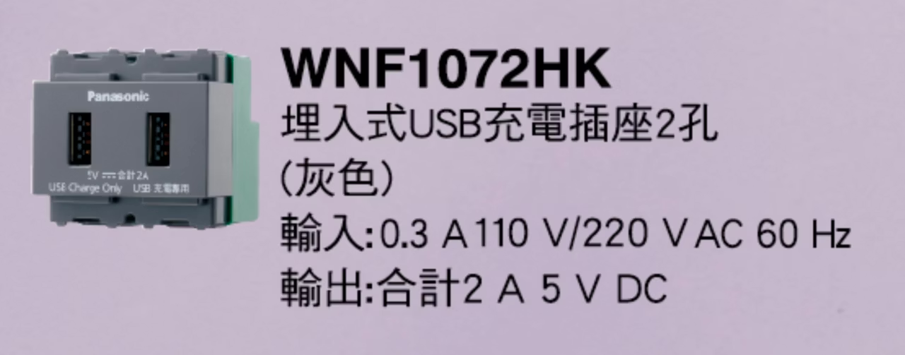 國際牌Panasonic 埋入式USB充電插座2孔 2A-灰色_WNF1072HK