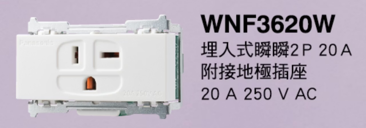 國際牌Panasonic 埋入式2 P 20 A附接地極插座_WNF3620W