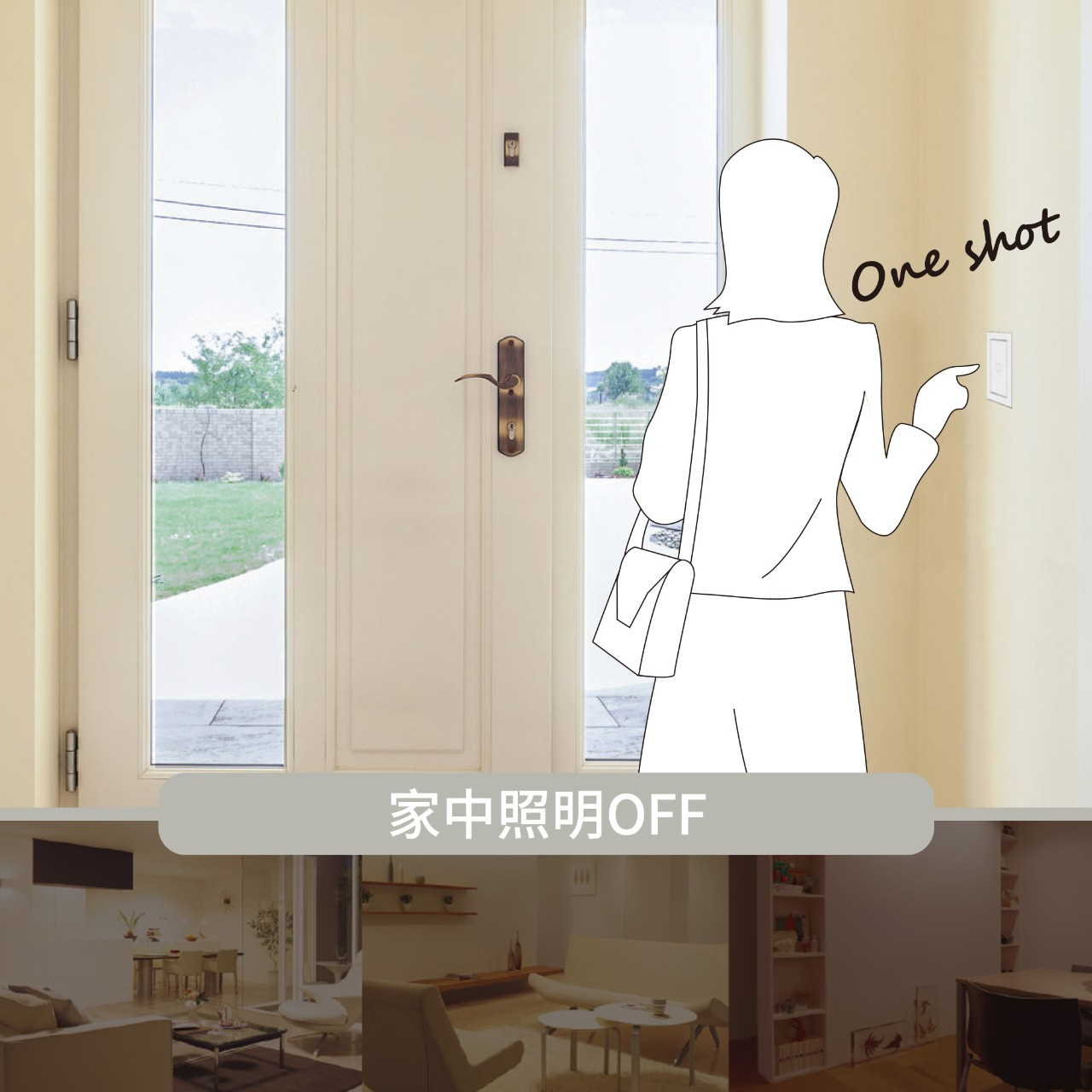 安裝One-Shot節能控制開關在玄關,外出時只要一鍵關閉,房間的所有照明立即熄燈,方便快速的同時也可避免忘記關燈。