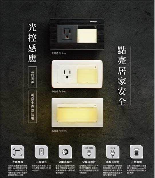 半幅式設計/110V電壓輸入搭配附接地極插座,適用於走廊、書房、臥室、飯店等同時需要低度照明及插座的場所,實用性絕佳。